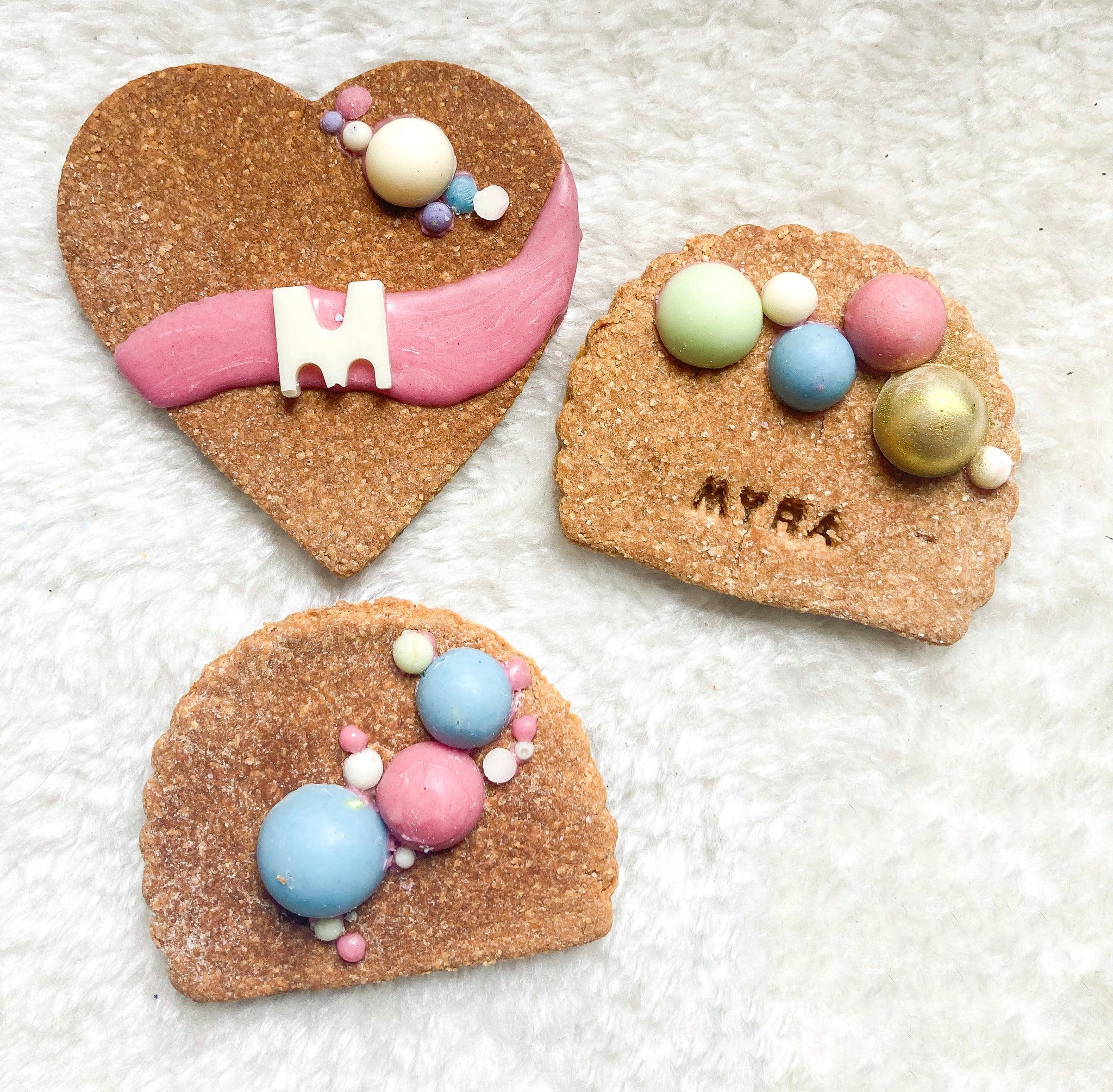 Well these are our famous Peanut Butter biscuits covered in 3D decorations of your choice, or let us decide! These biscuits were inspired by hooman fondant biscuits, why do hoomans get all the fun? After 3 months (YES 3!) of research, Pooch Aunty N was finally able to replicate the texture and pawliciousness of hooman fondant biscuits for dogs!