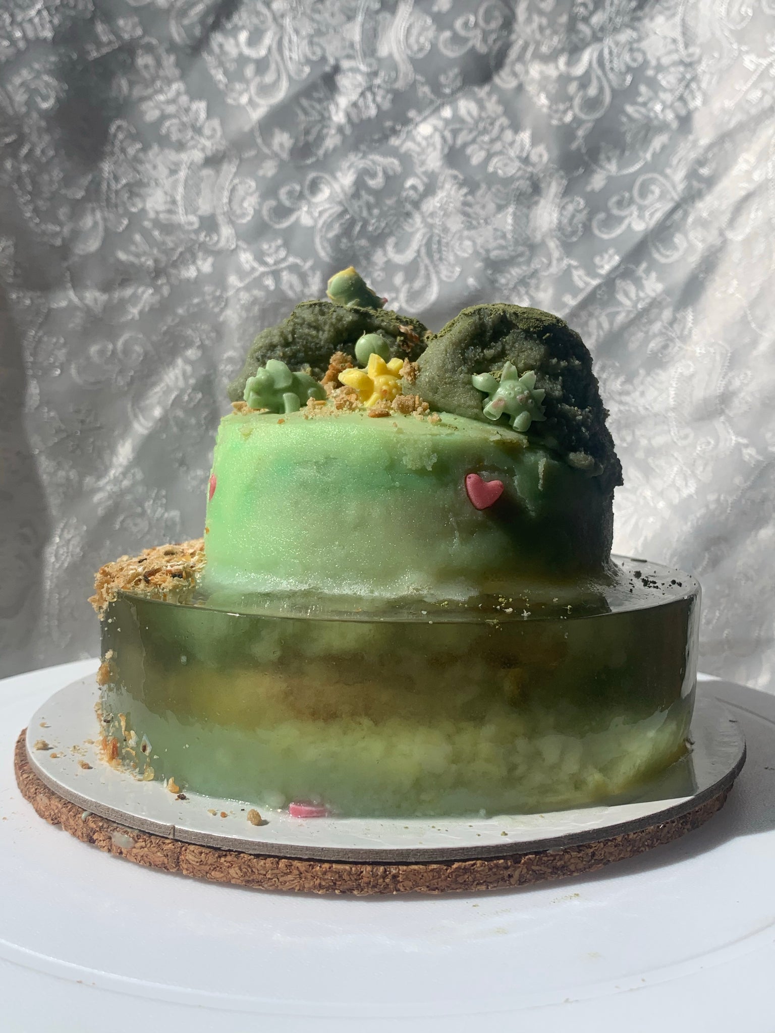 We can custom this cake to your design and colours. The pictured cake is a Dino cake with Dino candy + a see through under the mountain broth. It was created so you can see right through the bone broth cake into the base of the 4” cake. Simply send us a message on Instagram or email us to design your own bone broth cake!
