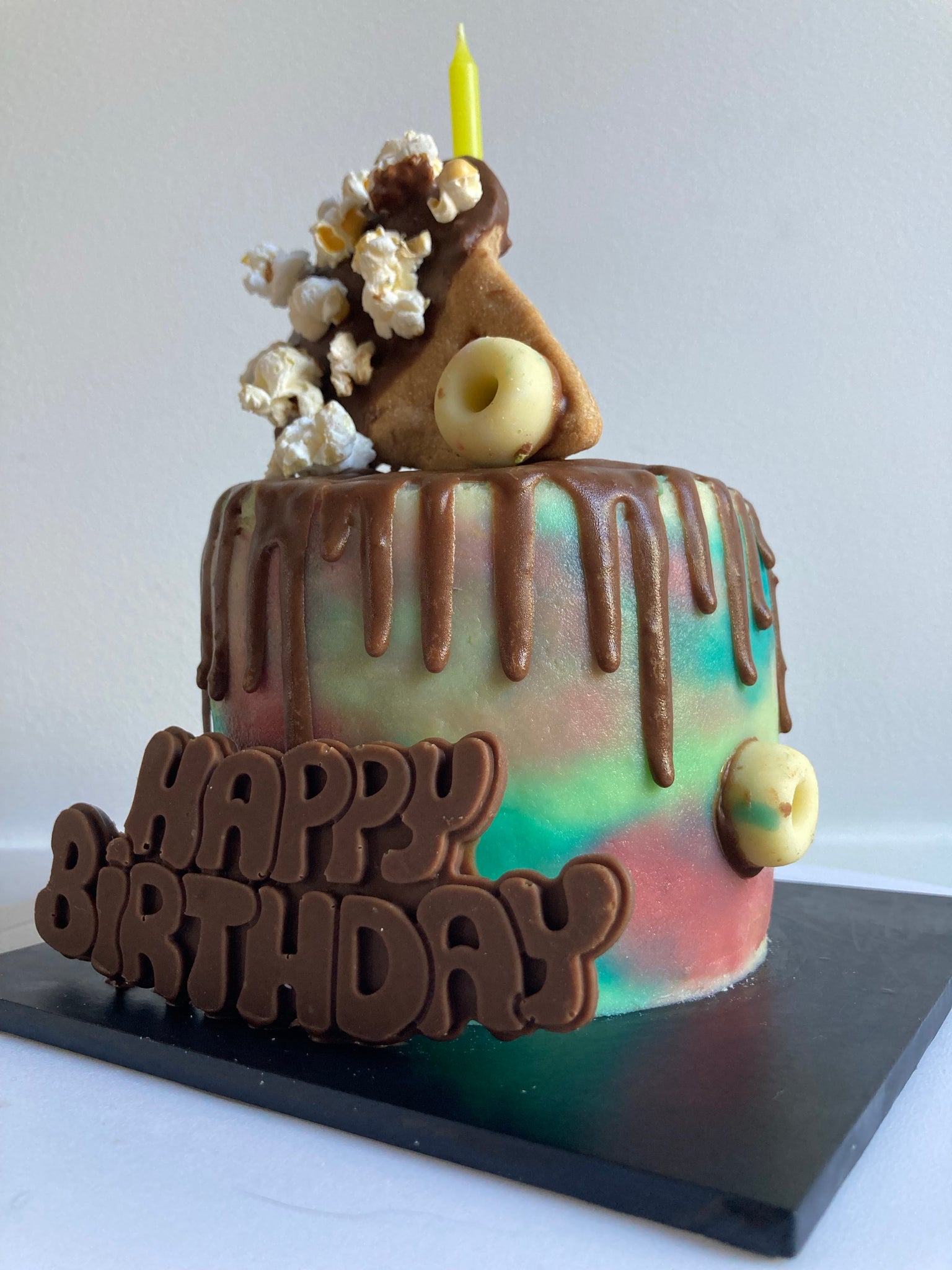 Customisation at cost: Any major additions such as a new topper, biscuits or dog choc with name/age etc. If your cake below contains a happy birthday plaque, or name/age in picture, then this will be provided at no cost.